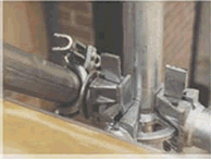 The second method of supporting stage decks is via a construction scaffold system; ours is from the well-recognized manufacturer Etobicoke Ironworks. Construction scaffold works with uprights or "standards" of various lengths, tied together with horizontal and diagonal support braces which lock into place with eight-way "Modex" joints, seen here: